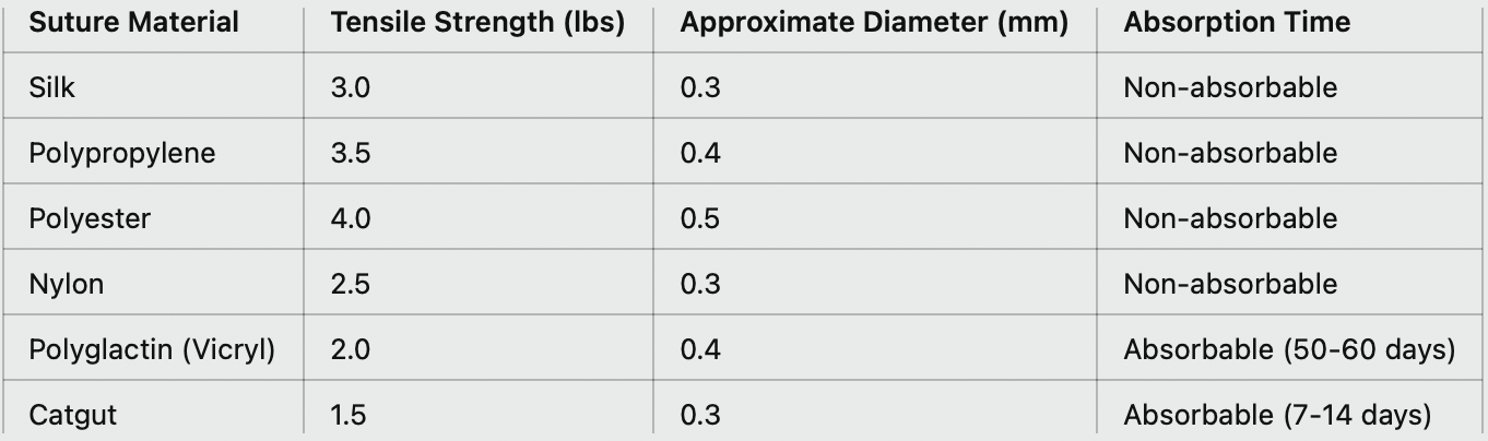 Kev xaiv ntawm absorbable thiab non-absorbable sutures kuj tseem ceeb heev. Absorbable sutures, xws li polyglactin, maj mam poob lawv lub zog tensile raws li cov ntaub so ntswg kho, thaum tsis-absorbable sutures, zoo li polypropylene, tuav lawv lub zog mus tas li. Kev nkag siab txog lub sijhawm kho kom zoo rau cov ntaub so ntswg tshwj xeeb yuav pab xaiv txoj cai suture.
